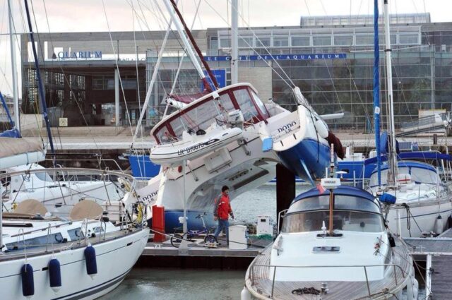 Das sieht nicht gut aus. Der Katamaran „Dodo“ liegt in extremer Schräglage im Hafen von la Rochelle direkt vorm Aquarium. Was war passiert? Es gibt keine Meldungen dazu, aber bei der Betrachtung des Bildes sieht es danach aus, dass der Kat während dem Hochwasser mit dem Steuerbordrumpf wohl über dem Dalben parkte. Bei Springtide kann der Tidenhub in La Rochelle 5-6 Meter betragen, was dann zu einer solchen Situation führen kann.