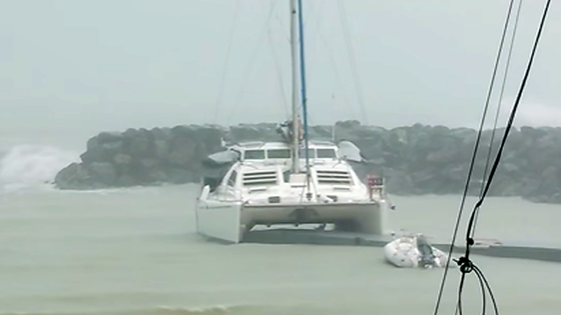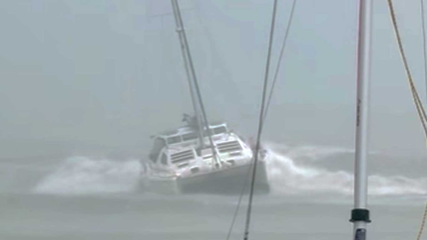 Der Vorfall ereignete sich gestern im australischen Airlie Beach vor dem Whitsunday Sailing Club. Der Zweirümpfer hatte zuvor an einer Mooring festgemacht, die im Starkwind offenbar ihren Geist aufgab. Das Schiff wurde von Wind und Welle in den Hafenbereich getrieben. Beim Betrachten der Hafenanlage auf Satellitenbildern bekommt man einen Eindruck davon, wie schnell der Kat getrieben wurde. Rechts und Links der Anlage: hohe Felsaufschüttungen.