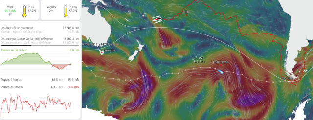 Bei diesem Abstecher in den Norden hat er inzwischen insgesamt fast 18.000 Seemeilen über Grund absolviert – obwohl es auf der Idealroute nur 8600 gewesen wären. Dabei fiel er zwischenzeitlich sogar mehr als 1000 Meilen hinter die Referenzzeit zurück. Aber seit heute liegt er wieder knapp – mit 16 Meilen – vorne.