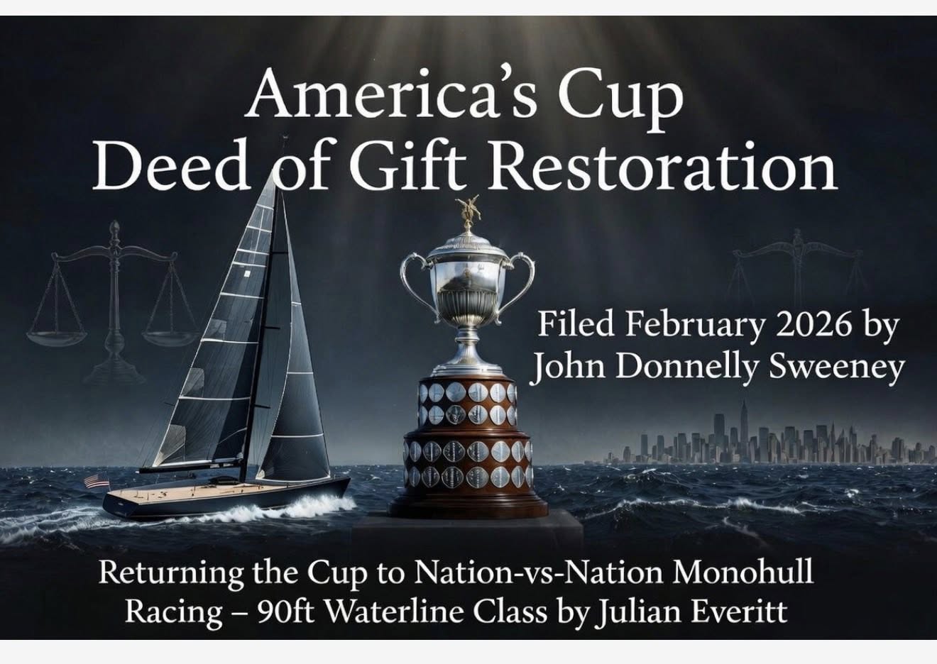 Sweeney behauptet allerdings, dass hierbei die traditionelle Verwaltung durch gemeinnützige Yachtclubs illegal durch gewinnorientierte Unternehmen ersetzt wurde, was den Treuhandcharakter der Veranstaltung zerstöre. Stattdessen möchte er den 38. America’s Cup, der 2027 in Neapel stattfinden soll, auf Yachten austragen sehen, „die von Menschen und nicht von Foils angetrieben werden“.