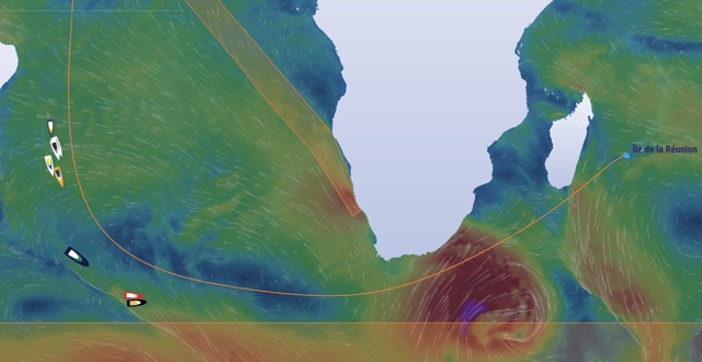 Lennart Burke und Melwin Fink haben knapp haben von den 7000 Meilen auf dem Weg nach La Réunion noch 4000 vor dem Bug und steuern jetzt wieder Ostkurs. Sie fallen dabei immer weiter hinter das Führungsduo zurück – gebremst auch durch einen Blockschaden am Großsegeltopp. Fink musste dafür in den Mast steigen.
