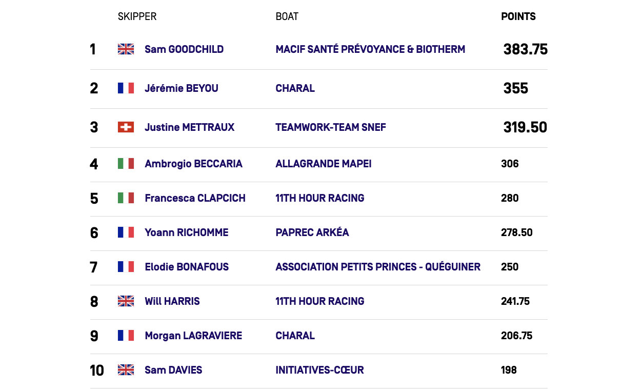 Es war eine beeindruckende Gesamtleistung, mit der Goodchild nun mit 383,75 Punkten und fast 29 Punkten Vorsprung an der Spitze der 2025 IMOCA Globe Series steht. Auf dem zweiten Platz liegt der Gewinner der Transat Café L’OR und Skipper von Charal, Jérémie Beyou, mit 355 Punkten, während die Rolex-World Seglerin des Jahres, Justine Mettraux aus der Schweiz, Skipperin des Teamwork-Team SNEF, mit 319,50 Punkten den dritten Platz belegt.