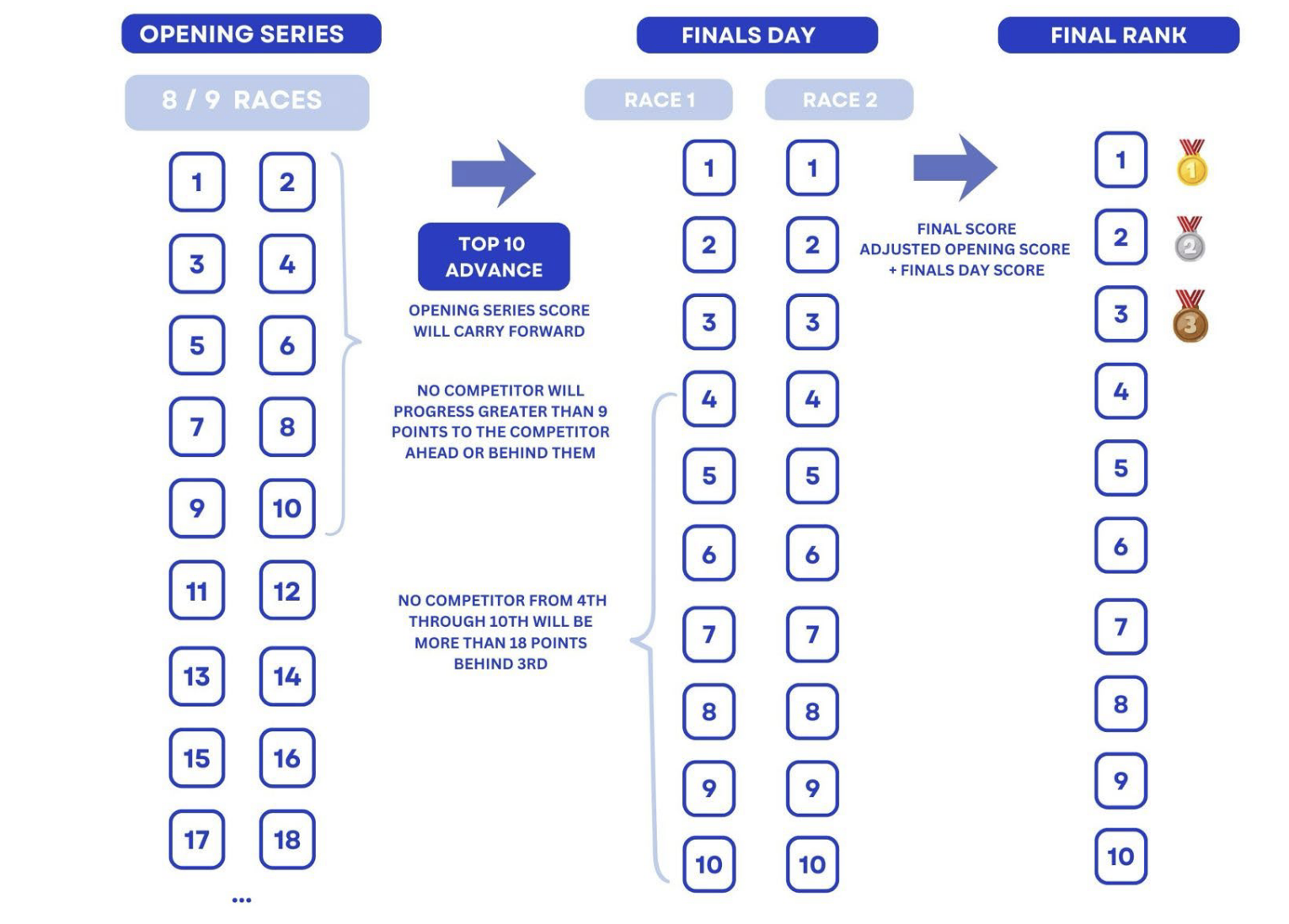 Die Ergebnisse wurden erstmals im 470er nach dem neuen Olympia-Format berechnet. Anders als noch beim ILCA7 Test auf Lanzarote gingen die Rennen der Vorrunde als eine einzige nicht streichbare Platzierung als Punkte in die Gesamtserie ein. Danach kam es dann vor den beiden Medalraces für die Top Ten zu den komprimierten Punktanpassungen, um die Finals spannender zu machen.