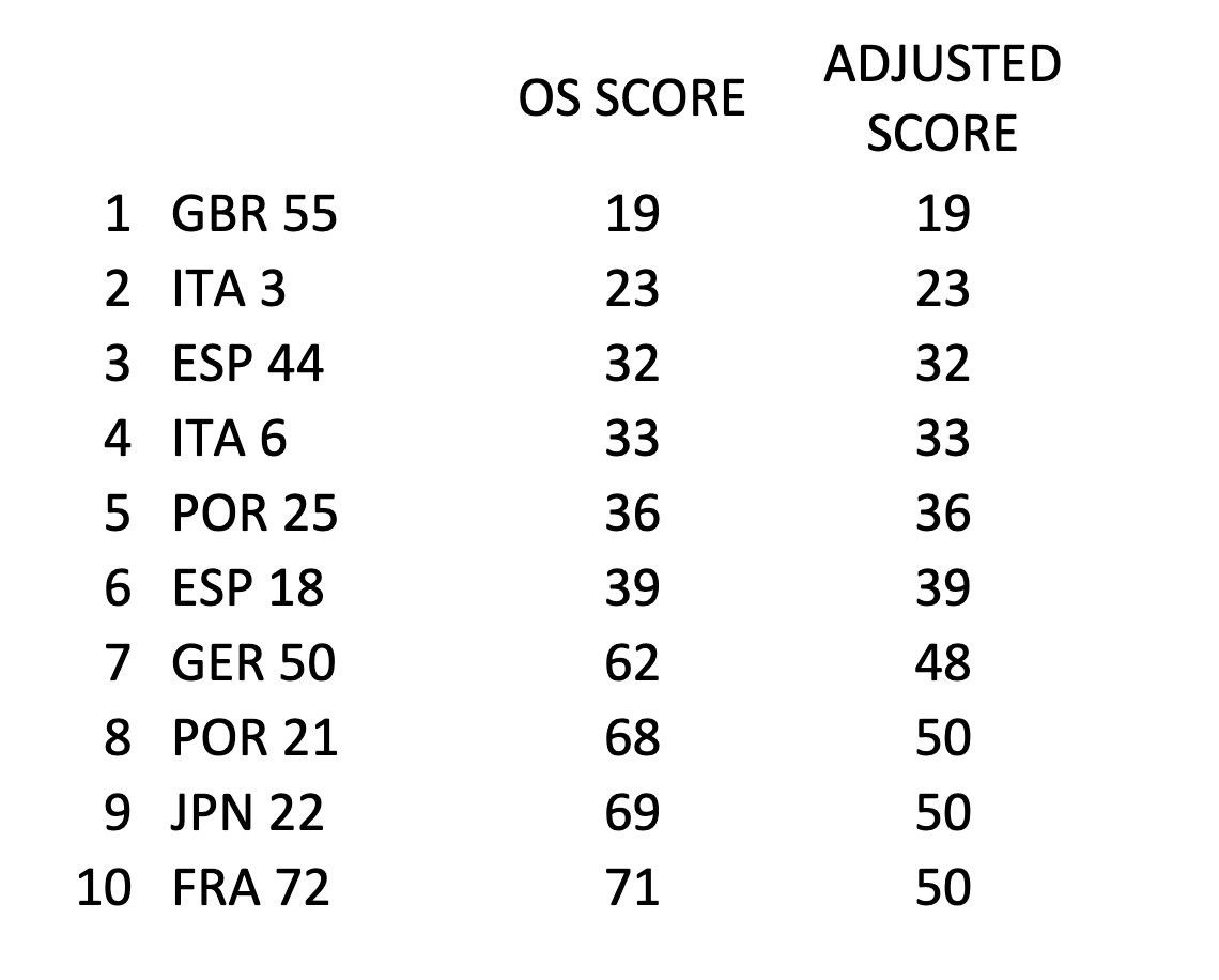 Im aktuellen Fall der 470er EM hatte diese Format-Änderung allerdings kaum einen Einfluss auf das Gesamtergebnis, da die Abstände zwischen den Platzierungen jeweils kleiner war als die zugelassenen 9 Punkte. Nur für die hinteren Ränge unter den Top Ten griff die Regel, dass der Rückstand zum letzen Medaillenplatz nicht mehr als 18 Punkte betragen darf.