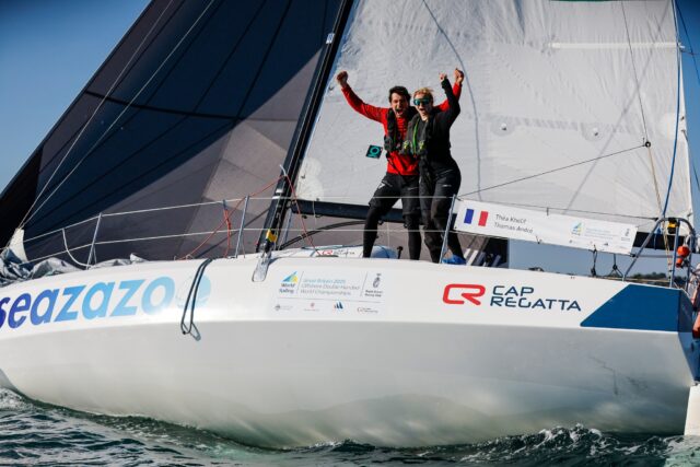 Bei der Offshore Mixed Double Handed World Championship hat ein junges Franzosen-Duo den Rest der Welt düpiert. Die deutsche Paarung Lina Rixgens und Sverre Reinke schlug sich bei teilweise skurrilen Leichtwindbedingungen gut und setzte früh viel auf eine Karte. Wie das Rennen verlaufen ist.
