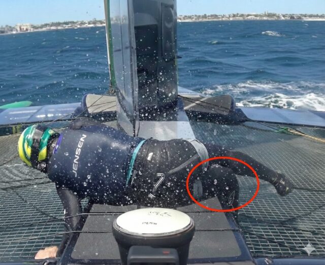 Wing Trimmer Iain Jensen wechselt vor einer Halse in voller Fahrt die Seite. Er sprintet über das Trampolin, muss die Mittelstrebe überwinden. Dann ein Schrei. „Hold, hold, hold…“ Steuermann Tom Slingsby soll das Manöver abbrechen. Jensen krümmt sich vor Schmerz. Sein Knie hat etwas abbekommen.